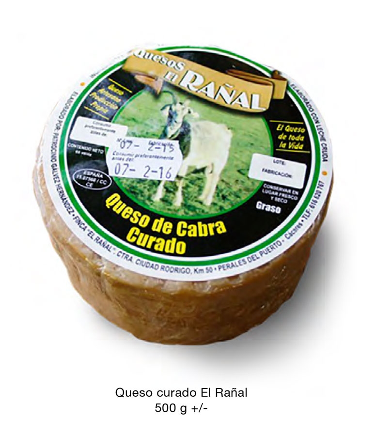Queso curado de cabra, elaborado artesanalmente con leche cruda de producción propia y envasado al vacío. Tres meses de curación. Sólo ingredientes naturales. Pieza de 600 gr. aprox. La GANADERÏA: Nuestras cabras son un cruce de: La cabra verata.El nombre de verata, tiene su origen en “la vera” comarca del Nordeste de la provincia de Cáceres considerada como la cuna de la raza. También ha sido denominada “Cabra Castellana” y “Cabra de los Montes de Toledo”. La cabra malagueña. Es una raza caprina española originaria de la provincia de Málaga, en Andalucía. Obtenemos con este tipo de cruce las ventajas del genotipo verato de adaptación y rusticidad y los de producción de leche, del genotipo murciano, con un alto rendimiento para la elaboración de nuestros quesos. Sobre La TRADICIÓN En Quesos El Rañal venimos de una familia de ganaderos caprinos, que se remonta a nuestros abuelos. Seguimos las enseñanzas y tradición de los que nos precedieron mejorando nuestro producto con nuevas herramientas y formación innovadora que nos permite ofreceros un producto artesano con las máximas garantías sanitarias sin perder ni una brizna de sus propiedades organolépticas. Os ofrecemos un producto artesano en el que se conjugan las esencias que la leche de nuestras cabras recoge de los pastos y arbustos de esta tierra, y la maestría quesera de Patro, nuestra maestra, poniendo a disposición, de vuestro deleite, un trozo de los valles de este rincón del norte de Cáceres. Ofrecemos de cabra de tres tipos: queso curado, queso curado en AOVE y queso curado al pimentón.