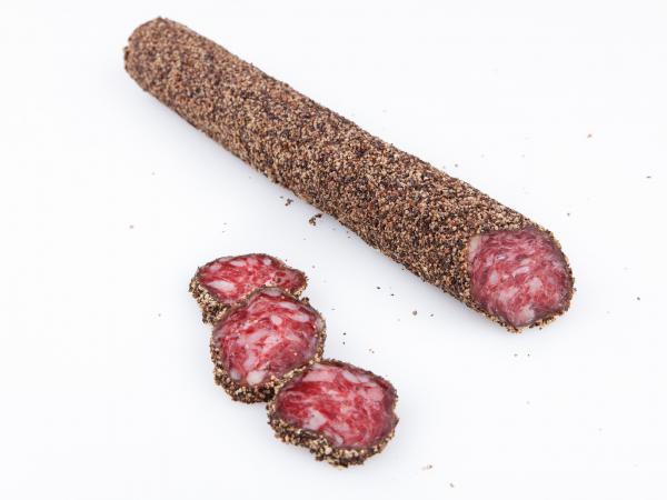 Salchichón a la Pimienta de Jabalí. Formato: al vacío individual. Peso: 220 grs.