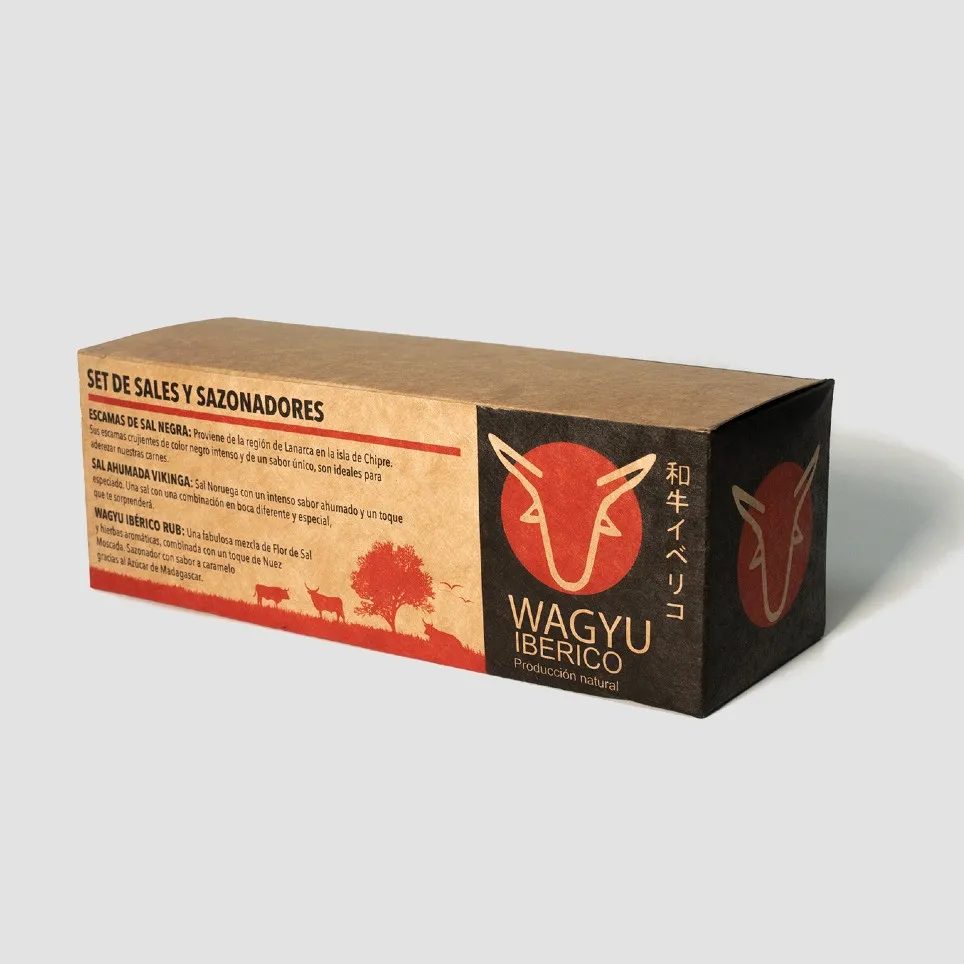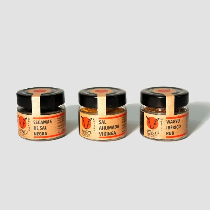 El Set de Sales y Sazonadores de Wagyu Ibérico ha sido creado para aportar nuevos matices y sabores que combinan perfectamente con el sabor de nuestros productos y complementan la calidad de nuestras carnes. El Set de Sales y Sazonadores contiene 3 botes de: Escamas de sal negra: Proviene de la región de Larnaca. Sus escamas crujientes de color negro intenso y con sabor único son ideales para aderezar nuestras carnes. Ingredientes: Sal Negra de Larnaca (Chipre). Alérgenos: No contiene. Peso: 35 g. Sal Ahumada Vikinga: Sal Noruega con un intenso sabor ahumado y un toque especiado, una combinación diferente y especial. Ingredientes: Sal Ahumada, Cúrcuma, Cilantro y Comino. Alérgenos: No contiene. Peso: 45 g. Wagyu Ibérico Rub: Sazonador con una mezcla de Flor de Sal, hierbas aromáticas y nuez moscada, combinado con Azúcar de Madagascar, con el que conseguimos un sabor a caramelo. Ingredientes: Flor de Sal, Hierbas Aromáticas, Nuez Moscada y Azúcar de Madagascar. Alérgenos: No contiene. Peso: 35 g. Origen: Extremadura